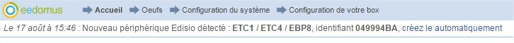 1 Commencez par insérer la pile dans l’interrupteur2 Pressez ensuite une touche de l’interrupteur et rendez vous sur le portail de la box eedomus, une nouvelle notification vous attend. 3 Via cette notification, la box à simplement détecté le nouveau périphérique. Cliquez simplement sur le lien “Créez le automatiquement” pour entrer dans sa configuration. Enfin complétez les infos du périphérique, son nom ainsi que sa pièce d’attribution, etc…