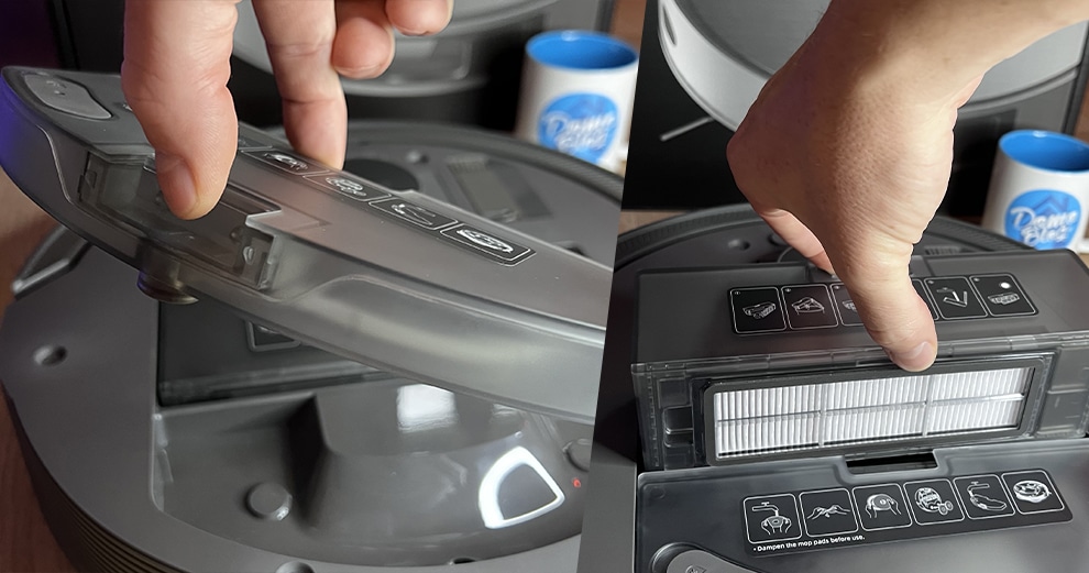 Pas de capot qui se lève sur ce L10S Pro pour accéder aux bacs à poussière et eau, mais une flasque supérieure aimantée qui se pose et se retire d’une facilité déconcertante.