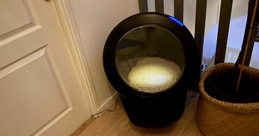 Mais Litter-Robot est aussi esthétique, disponible en noir ou en blanc. Loin des anciens modèles, son design est plus harmonieux et s’intègre mieux dans la maison. Mais clairement à des années lumière du bac a litière classique.
