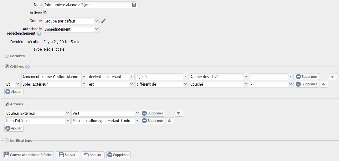 Du fait que j’ai installé le bulb RGBW dehors, je vais l’utiliser pour la lumière la nuit mais également pour me notifier. Je vais donc l’intégrer à mes règles de programmation de mon alarme, il pourra ainsi me notifier visuellement que l’alarme est bien activée mais également qu’elle est bien désactivée avant d’entrer dans la maison.